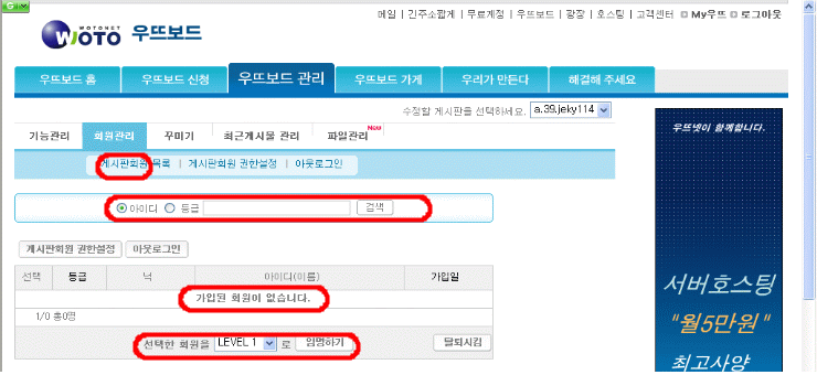 1. °Ô½ÃÆÇ ȸ¿ø°ü¸®¿¡ °üÇÑ Áú¹®ÀÔ´Ï´Ù. °¡. Àú´Â com.ne.kr¿¡ ȨÆäÀÌÁö¸¦ ¿Ã·Á³õ°í ÀÖ½À´Ï´Ù. ³ª. À§ÀÇ ÀúÀÇ È¨ÆäÀÌÁö¸¦ °³ÆíÇÏ¿© °¡Á·¹æÀ» °³¼³ÇÏ¿© À§¿Í °°ÀÌ ¡°¿ì¶ßº¸µå¡± °Ô½ÃÆÇÀ» ºÎÂøÇϰí, °¡Á·µé¸¸ ±ÛÀ» ¾µ ¼ö ÀÖ°Ô ÇϰíÀÚ, °¡ÀÔÇÑ °¡Á·µé¿¡°Ô ¡°°Ô½ÃÆÇȸ¿ø ±ÇÇѼ³Á¤¡±À» ÇÏ·Á°í, °ü¸®ÀÚÀÎ Àú°¡ ·Î±×ÀÎÀ» ÇÏ°í ¡®¿ì¶ßº¸µå°ü¸®¡¯¿¡ µé¾î°¡ ¡°°Ô½ÃÆÇȸ¿ø¸ñ·Ï¡±À» ¿¾îº¸¸é À§ÀÇ ±×¸²ÀÇ ³»¿ë°ú °°ÀÌ ¡°°¡ÀÔµÈ È¸¿øÀÌ ¾ø½À´Ï´Ù¡± ·Î ¶ß°í, °¡ÀÔÇÑ È¸¿ø ID·Î °Ë»öÀ» ÇØºÁµµ ¾Æ¹«·± ¹ÝÀÀÀÌ ¾ø½À´Ï´Ù. ÇöÀç·Î¼´Â ȸ¿øÁ¦ °Ô½ÃÆÇÀ» ¼³Á¤ÇغÁ¾ß ¾Æ¹«·± Àǹ̰¡ ¾ø½À´Ï´Ù. ´Ù. À§ÀÇ ±×¸²ÀÇ ºÓÀº Ÿ¿ø ¼± ¾ÈÀÇ ³»¿ëµéÀ» »ìÆìº¸½Ã°í, ¹«¾ùÀÌ ¹®Á¦ÀÎÁö ¾Ë·Á Áֽñ⠹ٶø´Ï´Ù. |