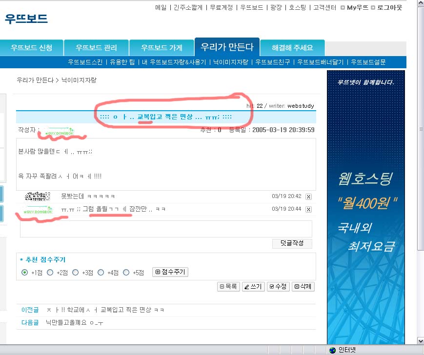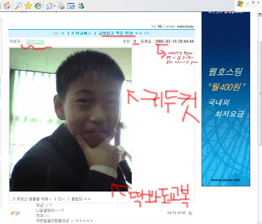 ¾Æ´Ô 2005³â 3¿ù 19ÀÏ¿¡ ³Í ±³º¹ÀÔ°í ÃʵîÇб³ °¡¼ Âï¾ú´ø »çÁøÀ» ¿Ã·È´Ù´Â °Å´Ï ÃëÇâ Çѹø µ¶Æ¯Çϱ¸³ª ¾Æ´Ô ÃʵîÇб³ ´Ù´Ò¶§ ±³º¹À» ÀÔ°í ´Ù³æ¾ú´Ù´Â ¶æ? ±×¸®°í ´Ï°¡ ÄÄÀ» ³ªº¸´Ù ÀßÇÏ´ø ¸øÇÏ´ø ³ª¶û ¹º»ó°ü ÀÚ¶û Á» ±×¸¸Çضó ±×°Å¿¡ ¸ñ¸Å¼ ÂîÁúÀ̰°´Ù. ¾îÂ÷ÇÇ ¼¼»ó¿£ ³Êº¸´Ù ÄÄ ÀßÇÏ´Â »ç¶÷ÀÌ ±ò¸®°í ±ò·È´Âµ¥ ´Ï°¡ äÆÃ¹æÀ» ¸¸µé´ø ¾î¼´ø ÀÌ¹Ì ¸¸µé¾î³í»ç¶÷ÀÌ ±ò·È´Ù. ³Í Á» ÁøÃëÀûÀ̰í âÁ¶ÀûÀÎ »ý°¢À̳ª ÇØ¶ó ¿ô±ä´Ù~ ³»°¡ ÄÄÀ» Áø·Î·Î »ý°¢ÇÑ´Ù°í ÇÑÀûµµ ¾ø´Âµ¥ ¾Õ¼³ª°¡½Ã±â´Â ±×·¯´Ï±î ³Ê´Â ÀÌ ÀÛÀº °Ô½ÃÆÇ¾È¿¡¼µµ ¹þ¾î³ªÁú ¸øÇÏ´Â °Å¾ß ³»°¡ ¸»ÇßÁö ³Ê ¿ì¹°¾È °³±¸¸®¶ó°í