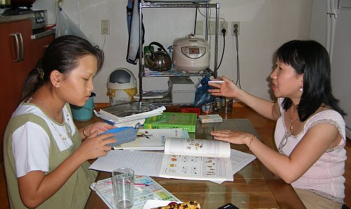 ¡ÞÇѱ¹¾î±³À° ¹æ¹®Áöµµ»çÀÎ ¹¿¶ì¿£(¿À¸¥ÂÊ)¾¾°¡ º£Æ®³² °áÈ¥ ÀÌÁÖ¿©¼º¿¡°Ô ÇѱÛÀ» °¡¸£Ä¡°í ÀÖ´Ù.